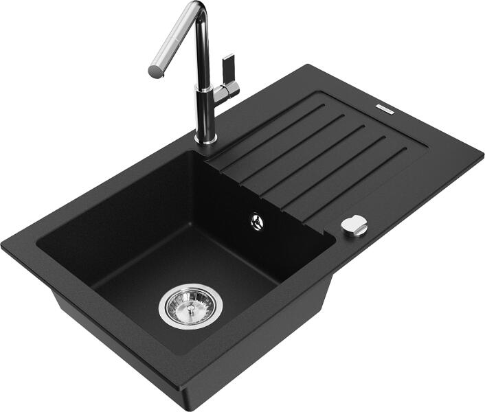 Mexen Cesar, gránit mosogató 775x470x190 mm, 1 kamrás és Duero fekete matt csaptelep, fekete foltos, 6514-76-671600-70-B A konyhai mosogató műszaki adatai: Gyártó: Mexen Sorozat: Cesar Modell: 1 kamrás Felszerelés: munkalapra Szín: fekete foltos Felületkezelés: sima Hossza 775 mm Szélesség 470 mm Magasság: 190 mm Kamra mélysége: 180 mm Kamra mérete: 410x355 mm Lefolyó átmérő