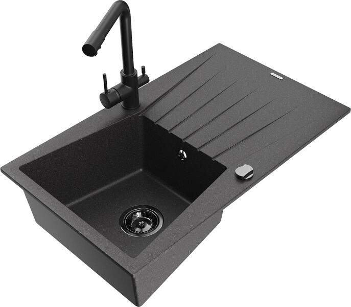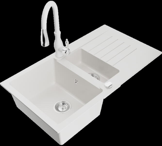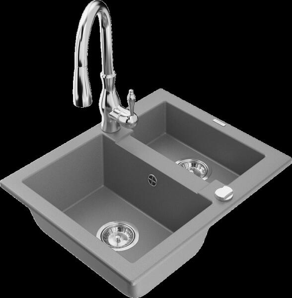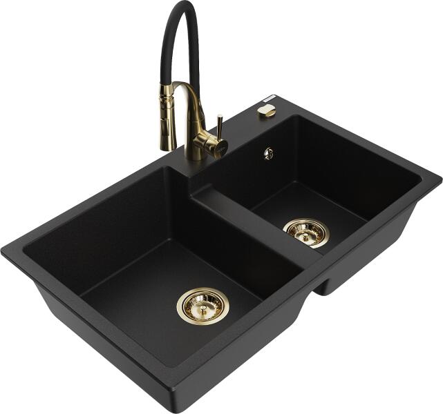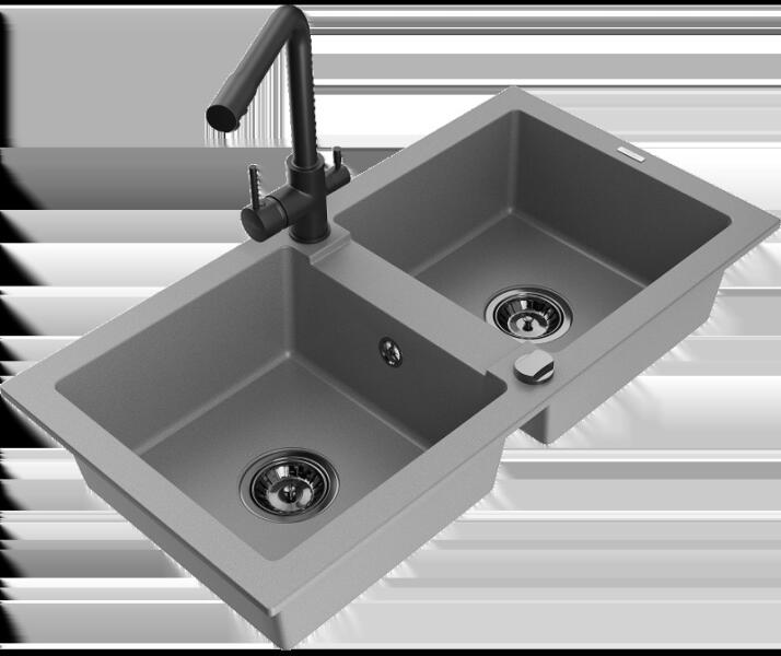 Mexen Tomas konyhai mosogató: Gyártó: Mexen Sorozat: Tomas Modell: 2 kamrás Beépítés: felülről a munkalapba süllyesztve Méretek: 800x500x190 mm Kamra mélysége: 180 mm (nagyobb), 180 mm (kisebb) Kamra mérete: 440x387 mm (nagyobb), 370x303 mm (kisebb) Lefolyó átmérője: 90 mm Szifon + automatikus leeresztő csavar Anyaga: gránit (80% gránit - kő, 20% gyanta) Sima felület a könn