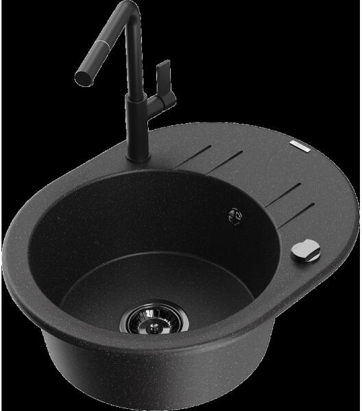 Mexen Carlos, 1,5 rekeszes gránit mosogató lefolyóval 582x475x177 mm és fekete foltos konyhai csaptelep Rita, fekete pettyes, 6518-76-670300-76 Műszaki adatok: Gyártó: Mexen Sorozat: Carlos Modell: 1,5-kamrás csepptálca nélkül Felszerelés: munkalapra Szín: fekete foltos Hossza 582 mm Szélesség 475 mm Magasság: 177 mm Kamra mélysége: 162 mm (nagyobb), 102 mm (kisebb) Kamra mérete