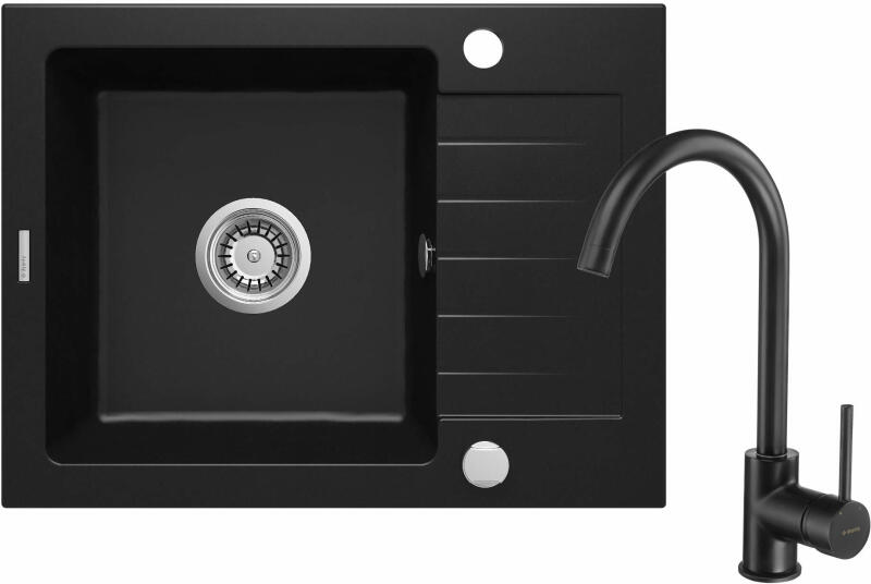 Deante Zorba, gránit mosogató 580x440x164 mm Z/KO, 3,5" + helytakarékos szifon, 1 kamrás + Milin csaptelep, fekete, ZQZAN11A Gránit mosogató: Gyártó: Deante Sorozat: Zorba Anyaga: 80% grezogránit, 20% akrilgyanta Szín: fekete / nero Felület típusa: matt Telepítés módja: a táblára Automata hulladéklezárót tartalmaz Szélesség [mm]: 440 Hossz [mm]: 580 Magasság [mm]: 164 Tálm