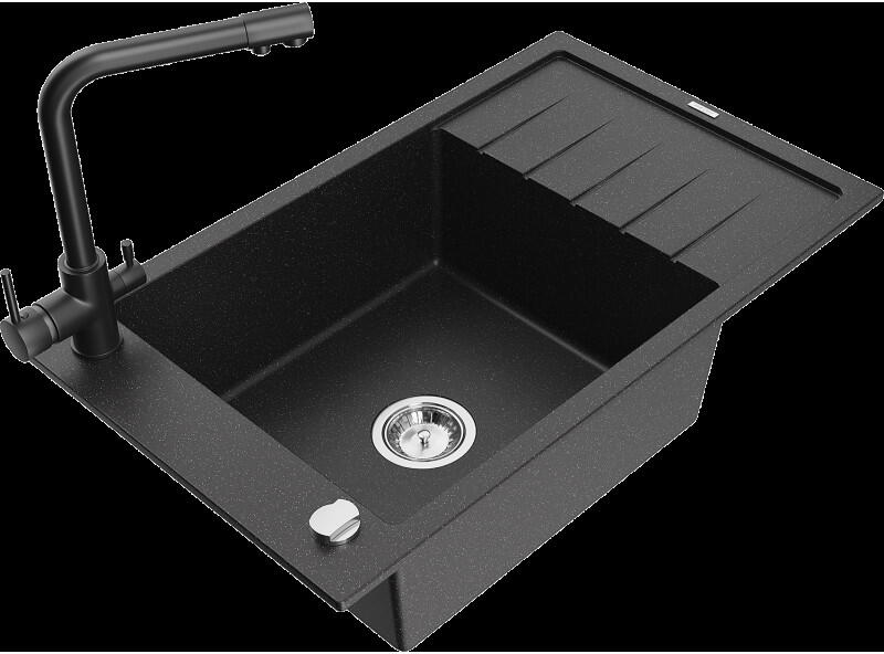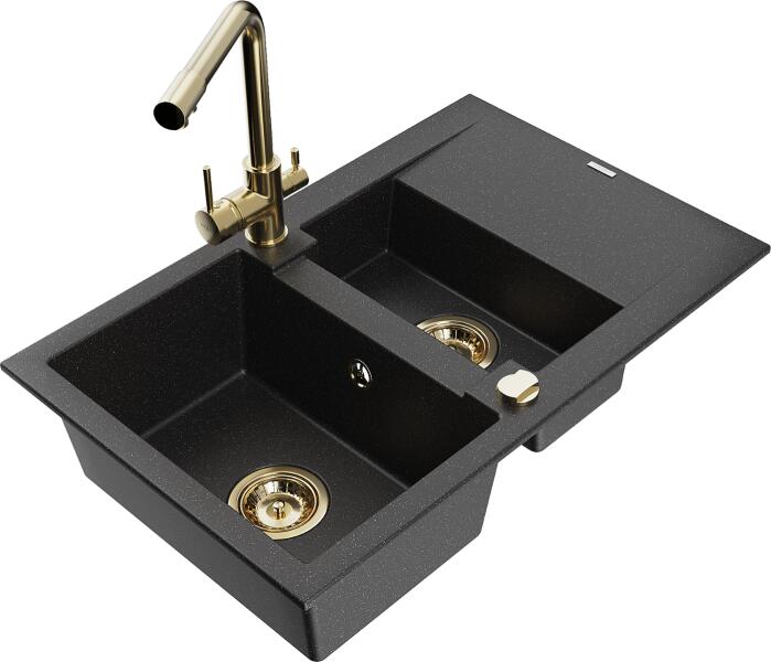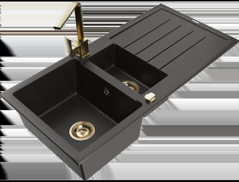 Mexen Gaspar, gránit mosogató 737x475x177 mm, 1,5 kamrás, Duero arany csaptelep, fekete-ezüst metál, 6507-73-671600-50 Gyártó: Mexen Sorozat: Gáspár Modell: 1,5-kamrás, rövid leeresztővel Felszerelés: munkalapra Szín: fekete - ezüst metál Hossza 737 mm Szélesség 475 mm Magasság: 177 mm Kamra mélysége: 167 mm (nagyobb), 107 mm (kisebb) Kamra mérete: 395x272 mm (nagyobb), 375x1