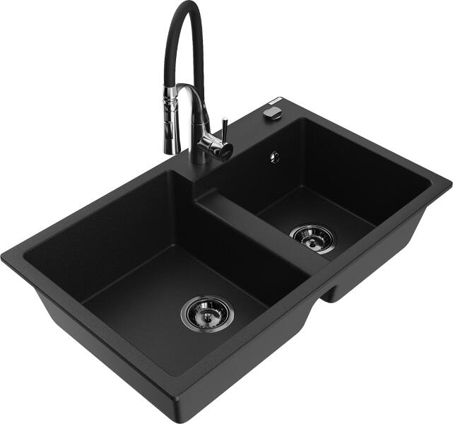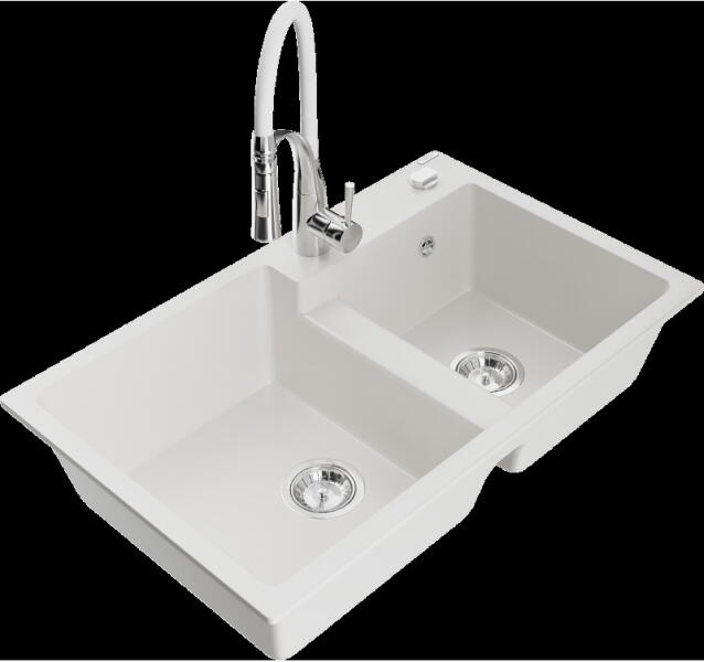 Mexen Tomas konyhai mosogató: Gyártó: Mexen Sorozat: Tomas Modell: 2 kamrás Beépítés: felülről a munkalapba süllyesztve Méretek: 800x500x190 mm Kamra mélysége: 180 mm (nagyobb), 180 mm (kisebb) Kamra mérete: 440x387 mm (nagyobb), 370x303 mm (kisebb) Lefolyó átmérője: 90 mm Szifon + automatikus leeresztő csavar Anyaga: gránit (80% gránit - kő, 20% gyanta) Sima felület a könn