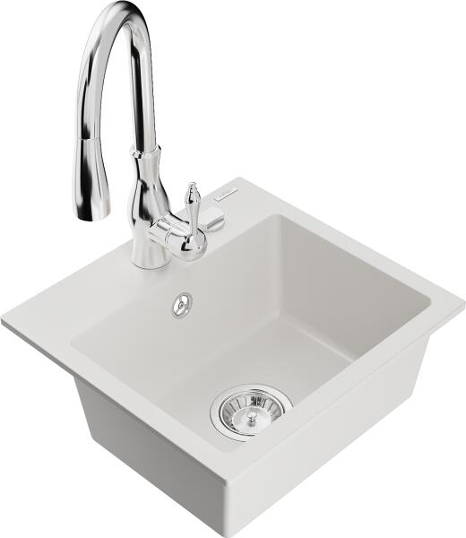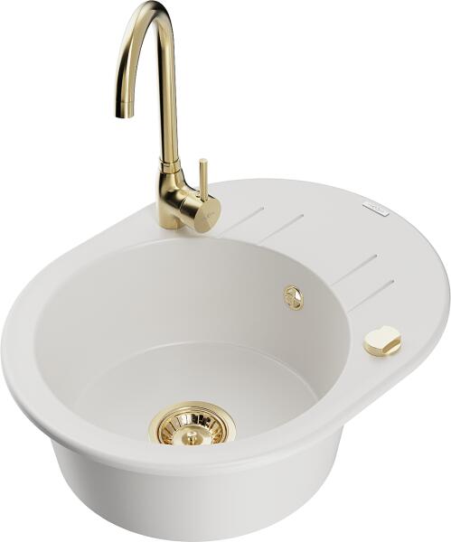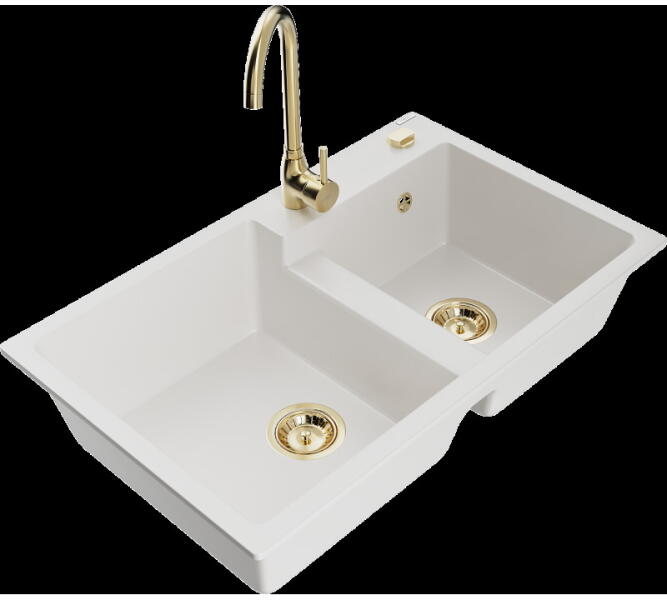 Mexen Kevin, gránit mosogató 586x458x190 mm, 1 kamrás és arany Telma csaptelep, fehér, 6517-20-670200-50 Gyártó: Mexen Sorozat: Kevin Modell: 1 kamrás, rövid leeresztővel Felszerelés: munkalapra Hossza 586 mm Szélesség 458 mm Magasság: 190 mm Kamra mérete: 378x374 mm Kamra mélysége: 175 mm A lefolyó átmérője: Ø 90 mm Szifon + automatikus leeresztő csavar Anyaga: gránit (80%