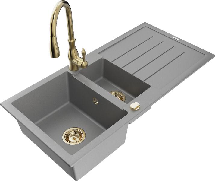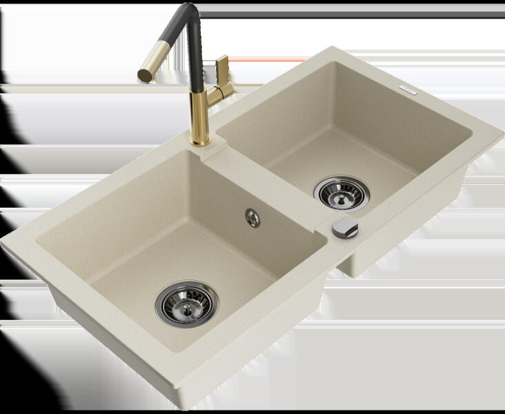 Gyártó: Mexen Sorozat: Andres + Savita Mosogató: Méretek: 1000x500x200 mm Kamra méretei: 430x330 mm (nagyobb), 340x170 mm (kisebb) Kamra mélysége: 190 mm (nagyobb), 115 mm (kisebb) Lefolyó átmérője: ø90 mm Típus: 1,5-kamrás lefolyóval Mosogató típusa: a munkalapba való beágyazáshoz Anyaga: gránit (80% gránit adalékanyag 20% gyanta) Túlfolyó nyílás: Igen Lyukak: 2 (1 lyuk