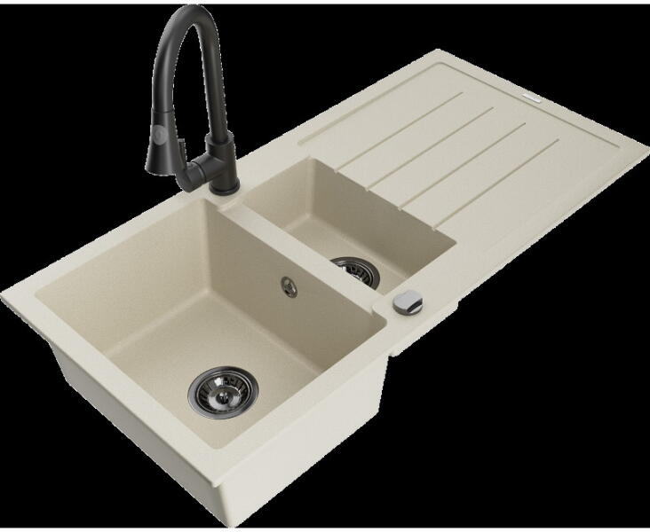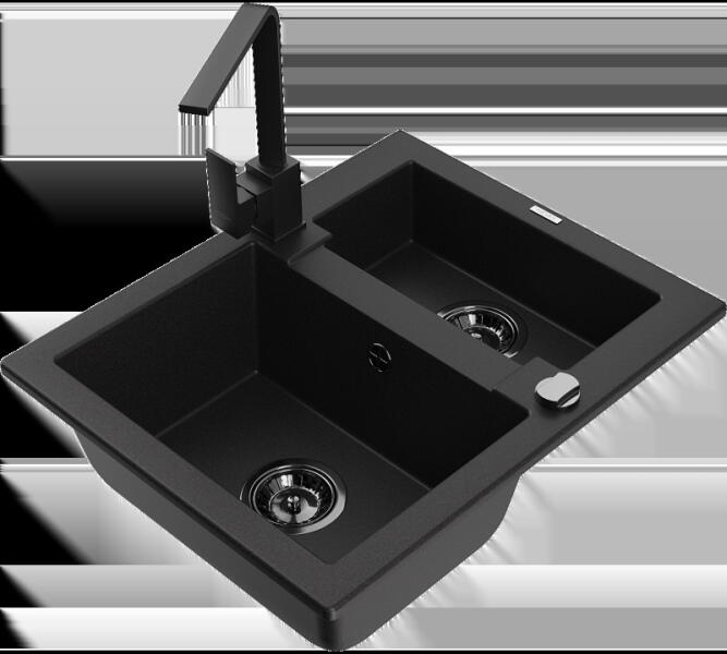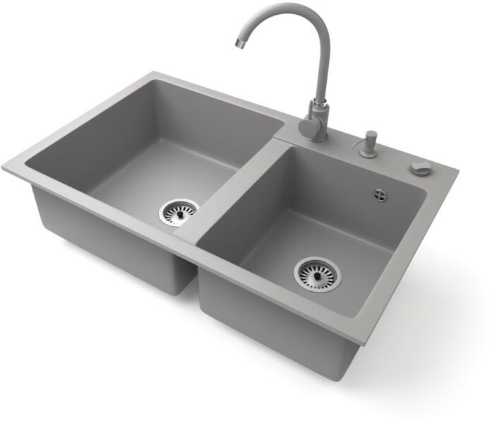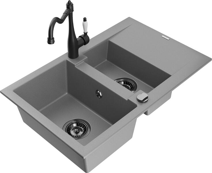 NERO Palazzo gránit mosogatótálca szürke színben csapteleppel, automata dugóemelővel és adagolóval. A kétmedencés mosogatótálcák 21. századi csúcsmodellje, ami két nagyméretű medencéjével és különleges kialakításával minden konyha tökéletes eleme lehet. Az asszimetrikus kialakításnak köszönhetően a kisebb medence fölött egy praktikus perem helyezkedik el, ahol h
