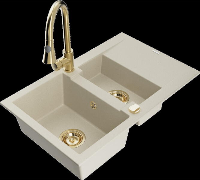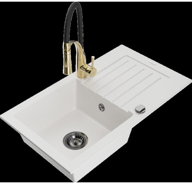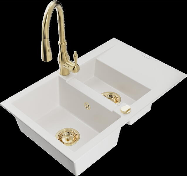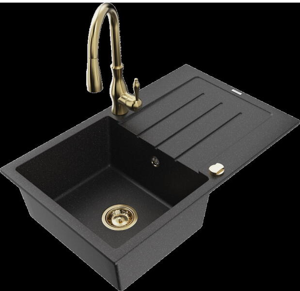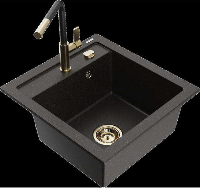Gyártó: Mexen Sorozat: Bruno + Carla Mosogató: Szín: fekete/arany metál Mérete: 795x495x200 mm Kamra - mélység: 200 mm Kamra méretei: 440x360 mm Kimeneti átmérő: ø90 mm Típus: 1 kamrás csepegtetővel Mosogató típusa: a munkalapba való beágyazáshoz Anyaga: gránit (80% gránit adalékanyag 20% gyanta) Túlfolyó nyílás: Igen Lyukak: 2 (1 lyuk a mosogató csapjához, 1 lyuk az