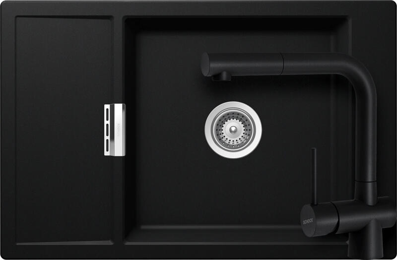 Schock Mono D-100XS konyhai mosogatótálca Cristadur Puro 780 x 510 mm, gránit, megfordítható, hagyományos beépítés, intenzív fekete munkalapba beépíthető, egymedencés, csepegtetővel ellátott, ideálisan illeszkedik a minimum 60 cm-es alsószekrényhez. A mosogatótálca megfordítható, a csaptelep helye előre elkészített, könnyedén áttörhető. A csomagban találja a haszná
