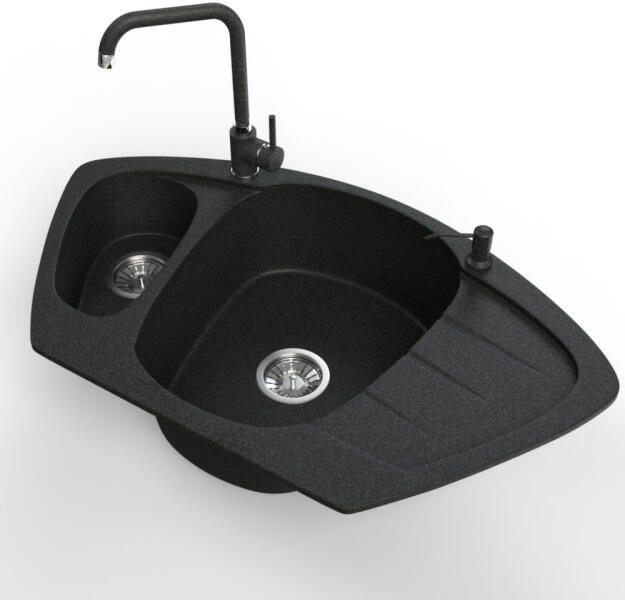 NERO Compact sarok gránit mosogató, ami egyben praktikus és impozáns látványelem is a konyhában. Tökéletes választás azokba a konyhákba, ahol a mosogató rész a sarokban lett kialakítva. Íves, de modern formatervezése nagyszerűen illik bármilyen stílusú konyhába. A mosogatón 2 lyuk lett kialakítva, egy a csaptelepnek és egy a beépíthető mosogatószer adagolónak vagy aut
