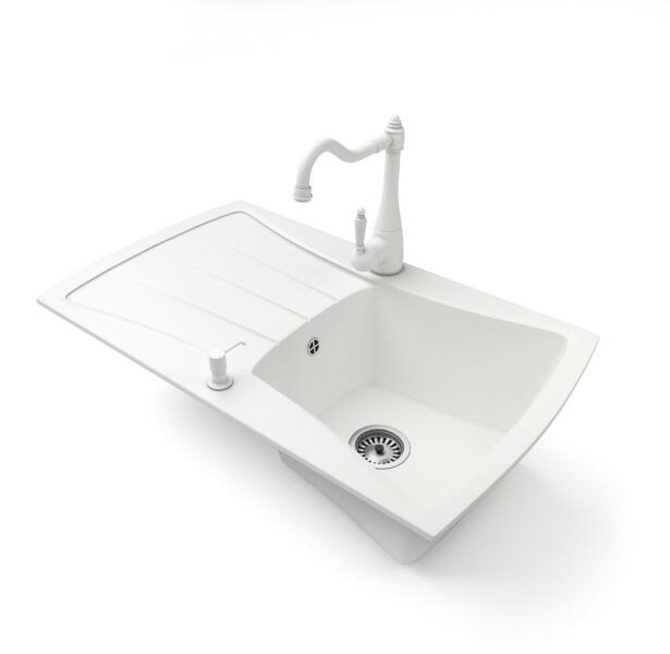 NERO Venezia gránit mosogató fehér színben. Egyedi és különleges formával tervezett egymedencés mosogató, kellően nagyméretű csepegtető résszel. A velencei gondolákat idéző, harmonikusan kialakított ívekkel a konyha esztétikus része, emellett anyagvastagságának köszönhetően rendkívül masszív konsktrukció. A mosogatón 2 lyuk található, egy a csaptelepnek és egy a
