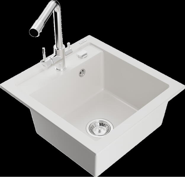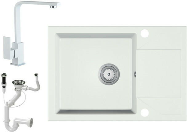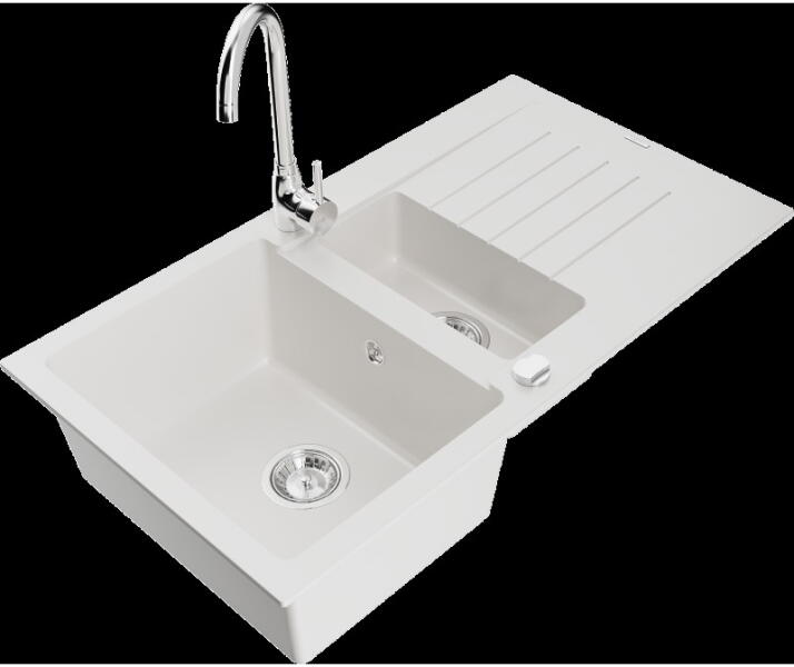 Adria (EOS) gránit mosogató szett fehér színben. Teljes készlet, ami tartalmazza a dugóemelővel ellátott szifont szettet és egy modern megjelenésű, kerámia betétes csaptelepet. Méreténél fogva ideális lehet olyan konyhákba, ahol az okos helykihasználás lényeges, viszont szükséges a megfelelő méretű medence és csepegtető is. A fehér gránit mosogatótálcák színe enyh