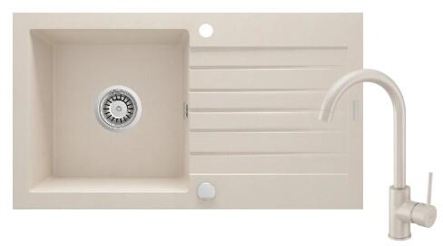 1 medencés, gránit mosogató csepegtetővel, csapteleppel|Kivitelezés: bézs|Beszerelési mód: süllyesztett|Minimális szekrényszélesség: 500 mm|Hosszúság: 760 mm|Szélesség: 440 mm|Magasság: 160 mm|Automatikus lefolyóelzárással ellátott szifonok|Leeresztő átmérője: 3,5'|Kész furatok száma: 2|Dugó típusa: automatikus|Helytakarékos szifon|Mosogatógép/mosógép csatlakozta