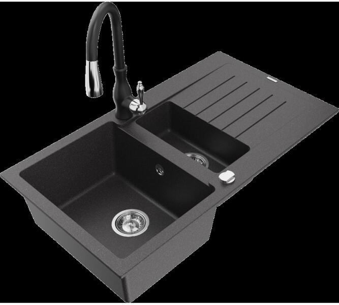 Pablo konyhai mosogató: Gyártó: Mexen Sorozat: Pablo Méretek: 752x436x161 mm Kamra mélysége: 151 mm Kamra méretei: 356x332 mm Lefolyó átmérője: ø90 mm Típus: 1 kamrás csepegtetővel Típus: a pultba süllyesztve Anyaga: gránit (80% gránit adalékanyag 20% gyanta) Túlfolyó lyuk: igen Lyukak: 2 (1 lyuk az akkumulátorhoz, 1 lyuk az automatikus szifondugó vezérléséhez) Be