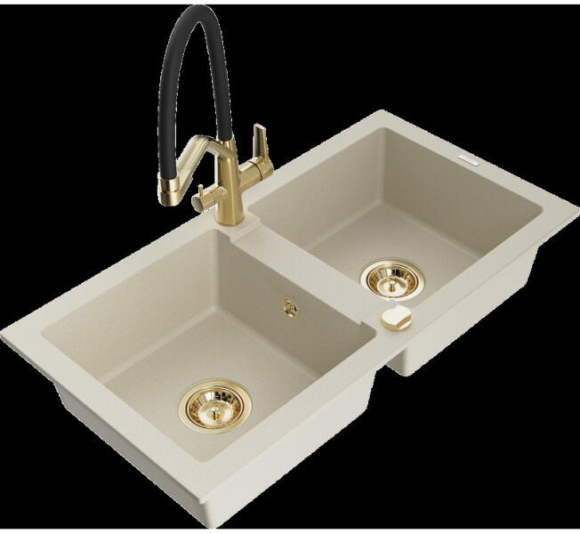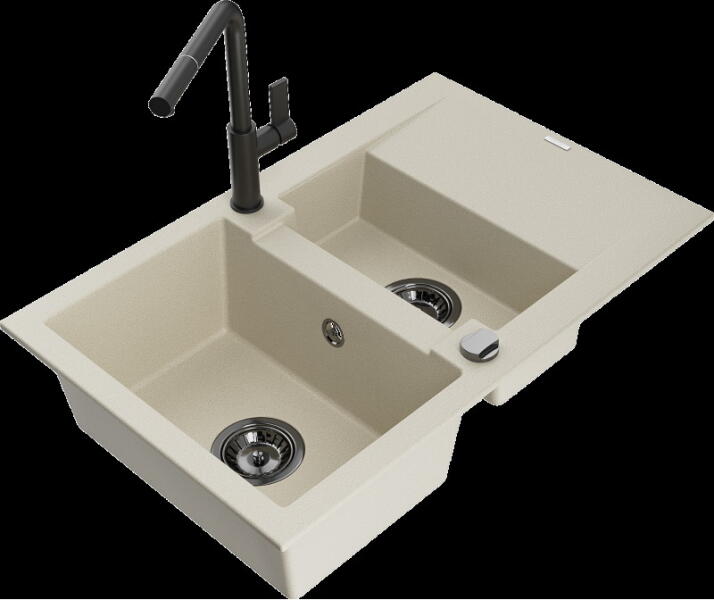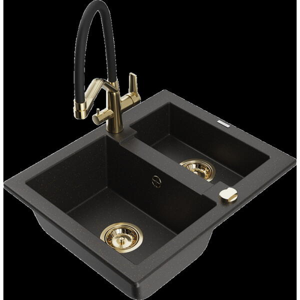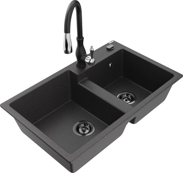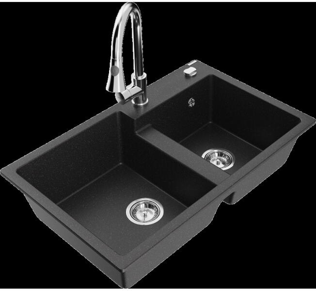 Mexen Tomas, gránit mosogató 800x500x190 mm, 2 kamrás és Savita mosogató csaptelep, fekete foltos, 6516-76-672601-70-B A konyhai mosogató műszaki adatai: Gyártó: Mexen Sorozat: Tomas Modell: 2-kamrás csepptálca nélkül Beépítés: a munkalapba való beágyazáshoz Szín: fekete foltos Felületkezelés: sima Hossza 800 mm Szélesség 500 mm Magasság: 190 mm Kamra mélysége: 180 mm (
