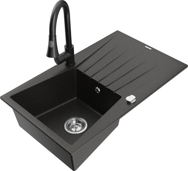 Mexen Leo, gránit mosogató 900x500x190 mm, 1 kamrás és fekete Duero csaptelep, fekete foltos, 6501-76-671600-70-B Gyártó: Mexen Sorozat: Leo Modell: 1-kamrás s csepegtetővel Szín: fekete foltos Felület: sima Hossza 900 mm Szélesség 500 mm Magasság: 190 mm Kamra mélysége: 180 mm Kamra mérete: 430x415 mm 500 mm-es méretű szekrényekhez Szifon + automatikus leeresztő csavar Anyaga
