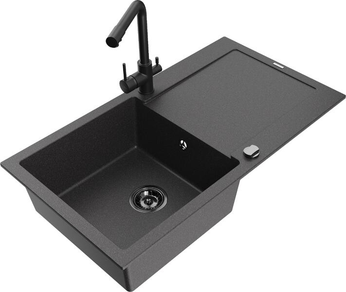 Mexen Milo, 1 kamrás gránit mosogató 435x410x171 mm és fekete Telma csaptelep, fekete, 6505-77-670200-70-B Mosogató: Gyártó: Mexen Sorozat: Milo Fekete szín Mérete: 435x410x171 mm Kamra mélysége: 161 mm Kamra méretei: 375x280 mm Lefolyó átmérője: ø90 mm Típus: 1 kamrás Típus: A pult tetejébe süllyesztett Anyaga: gránit (80% gránit adalékanyag 20% gyanta) Túlfolyó lyuk: i