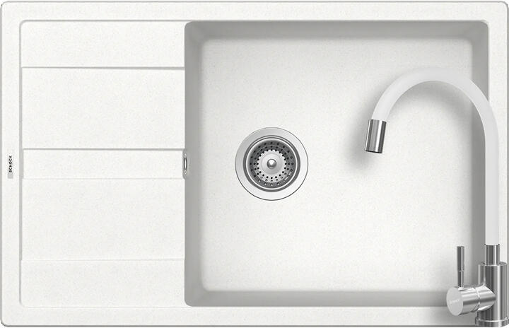 Schock Ronda D-100XL konyhai mosogatótálca Cristalite Alpina 780 x 500 mm, gránit, megfordítható, hagyományos beépítés, fehér munkalapba beépíthető, egymedencés, megfordítható, csepegtetővel ellátott, ideálisan illeszkedik a minimum 60 cm-es alsószekrényhez. A csaptelep helye előre elkészített, könnyedén áttörhető. A csomagban találja a használati útmutatót, amely