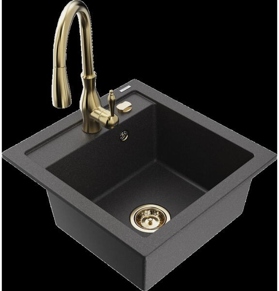 Mexen Enzo, gránit mosogató 576x465x174 mm, 1 kamrás és Carla mosogató csaptelep, fekete foltos, 6506-76-670700-70-B Gyártó: Mexen Sorozat: Enzo Modell: 1 kamrás, rövid csepegtetővel Beépítés: felülről a munkalapba süllyesztve Hossza 576 mm Szélesség 465 mm Magasság: 174 mm Szín: fekete foltos Kamra mélysége: 164 mm Kamra mérete: 395x320 mm Szifon + automatikus leeresztő cs