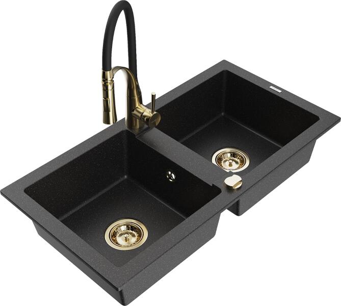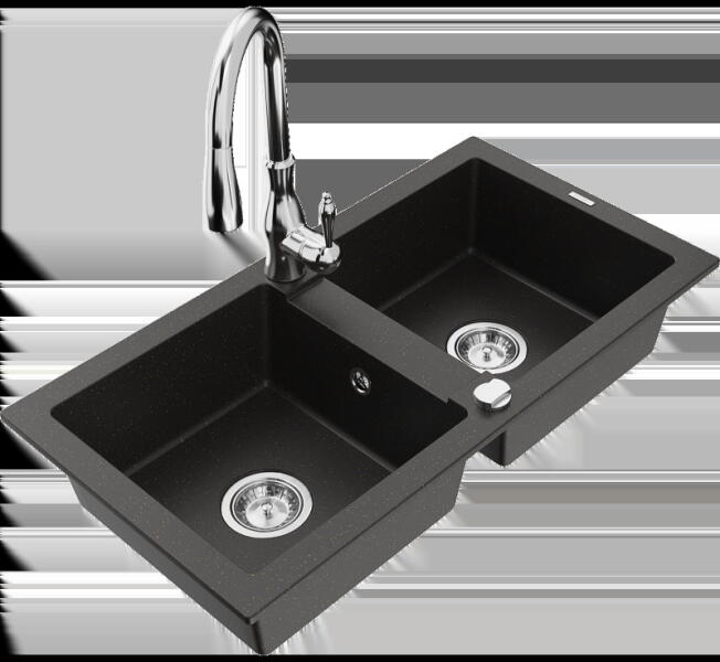 Mexen Mario, gránit mosogató 820x436x161 mm, 2 kamrás és Aster mosogató csaptelep, fekete-ezüst metál, 6504-73-73450-57-G Gyártó: Mexen Sorozat: Mario + Aster Mosogató: Méretek: 820x436x161 mm Kamra mélysége: 151 mm Kamra méretei: 356x336 mm Lefolyó átmérője: ø90 mm Szín: fekete/ezüst metál Típus: 2 kamrás Típus: felülről az asztal munkalapjába süllyesztve Anyaga: grá