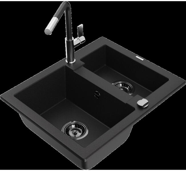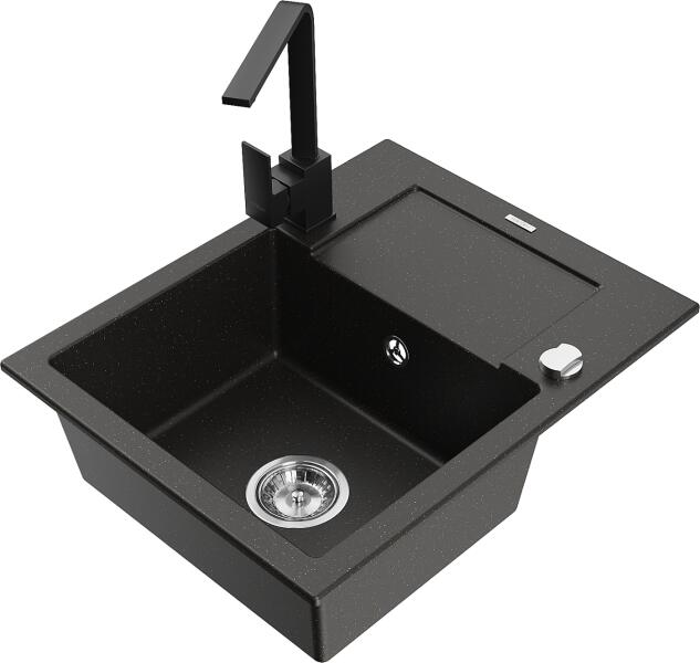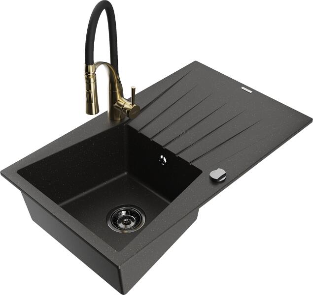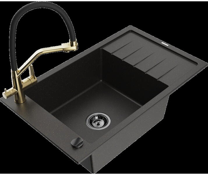 Mexen Enzo, gránit mosogató 576x465x174 mm, 1 kamrás és fekete Rita csaptelep, fekete-arany metál, 6506-75-670300-70 Gyártó: Mexen Sorozat: Enzo Modell: 1 kamrás, rövid csepegtetővel Hossza 576 mm Szélesség 465 mm Magasság: 174 mm Szín: fekete - arany metál Kamra mélysége: 164 mm Kamra mérete: 395x320 mm Szifon + automatikus leeresztő csavar Anyaga: gránit (80% gránit - kő, 2