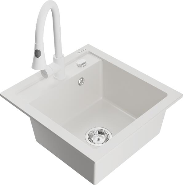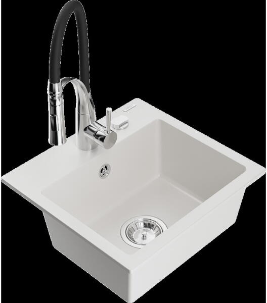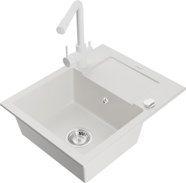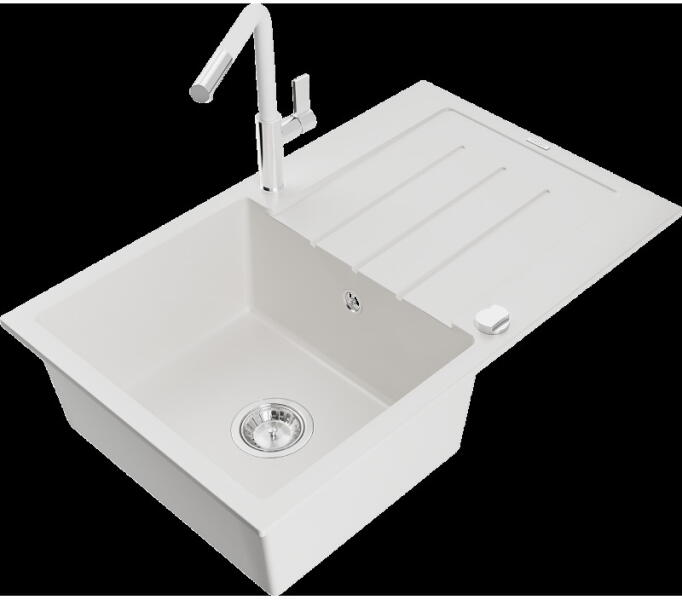 Mexen Enzo, gránit mosogató 576x465x174 mm, 1 kamrás, fehér matt Duero csaptelep, fehér, 6506-20-671600-20 Gyártó: Mexen Sorozat: Enzo Modell: 1 kamrás, rövid csepegtetővel Hossza 576 mm Szélesség 465 mm Magasság: 174 mm Kamra mélysége: 164 mm Kamra mérete: 395x320 mm Szifon + automatikus leeresztő Anyaga: gránit (80% gránit - kő, 20% gyanta) Megnövelt ütésállóság, karcol