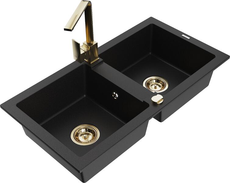 Mexen Mario, gránit mosogató 820x436x161 mm, 2 kamrás, fekete arany szifonnal és arany Rita mosogató csapteleppel, 6504-77-670300-50 Gyártó: Mexen Sorozat: Mario Modell: 2 kamrás Fekete szín Felület: sima Felszerelés: munkalapra Hossza 820 mm Szélesség 436 mm Magasság: 161 mm Kamra mélysége: 151 mm Kamra mérete: 356x336 mm Lefolyó átmérője: 90 mm Szifon + automatikus leereszt