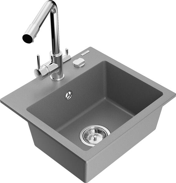 Mexen Milo, gránit mosogató 435x410x171 mm, 1 kamrás és Duero króm csaptelep, szürke, 6505-71-671600-00 A konyhai mosogató műszaki adatai: Gyártó: Mexen Sorozat: Milo Modell: 1 kamrás Felszerelés: munkalapra Szín: szürke Hossza 435 mm Szélesség 410 mm Magasság: 171 mm Kamra mélysége: 161 mm Kamra mérete: 375x280 mm Lefolyó átmérője: Ø 90 mm Szifon + automatikus leeresztő