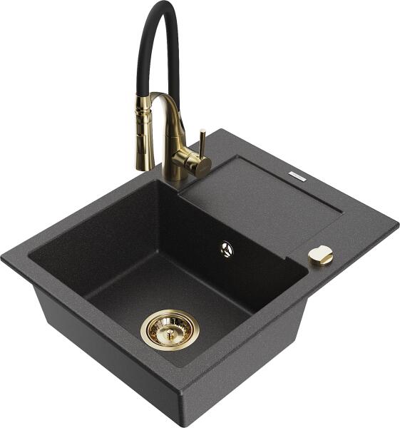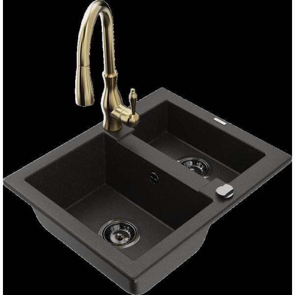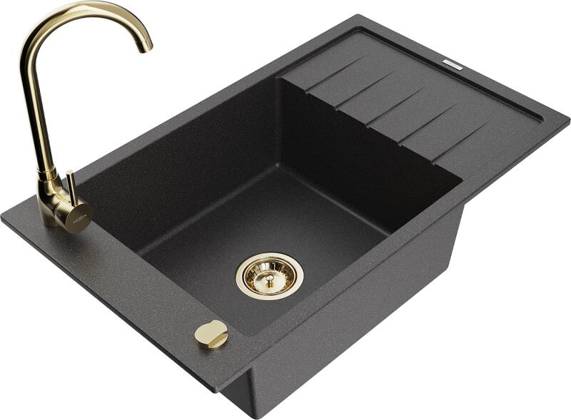 Mexen Elias, 1 rekeszes gránit mosogató lefolyóval 795x480x200 mm Telma arany fényes konyhai csapteleppel, fekete foltos, 6511-76-670200-50 Elias konyhai mosogató: Termékkód: 6511791005-76 Szín: fekete foltos Mérete: 795x480x200 mm Kamra mélysége: 190 mm Kamra méretei: 465x420 mm Lefolyó átmérője: ø90 mm Típus: 1 kamrás, rövid csepegtetővel Típus: a pultba süllyesztve Anyaga
