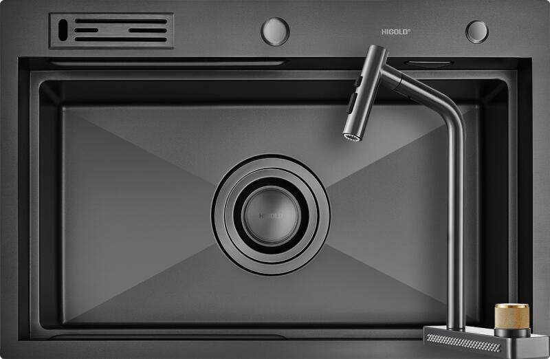 Higold 952357 konyhai mosogatótálca 750 x 480 mm, rozsdamentes acél, PVD Nano bevonat, kő textúra, hagyományos beépítés, kiegészitőkkel, gunmetal - Ez a Higold termékcsalád Nano bevonatú, kézzel készített, egytálas, rozsdamentes acél konyhai mosogatótálcája hatékony munkaállomás minden méretű konyhában. A csúcstechnológiás 3D eljárásnak köszönhetően a domboríto
