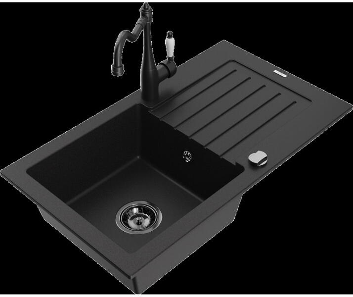 Mexen Gaspar, gránit mosogató 737x475x177 mm, 1,5 kamrás és fekete Telma csaptelep, fekete-ezüst metál, 6507-73-670200-70-B Gyártó: Mexen Sorozat: Gáspár Modell: 1,5-kamrás, rövid leeresztővel Felszerelés: munkalapra Szín: fekete - ezüst metál Hossza 737 mm Szélesség 475 mm Magasság: 177 mm Kamra mélysége: 167 mm (nagyobb), 107 mm (kisebb) Kamra mérete: 395x272 mm (nagyobb),