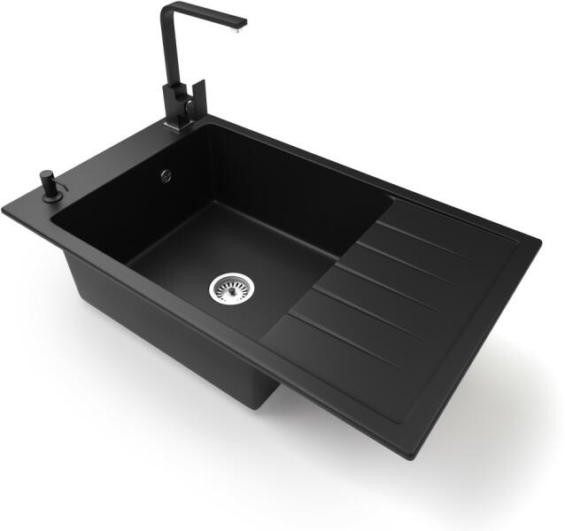 Nero Grande gránit mosogató, ami egyszerre modern és látványos, valamint tökéletesen kihasználható nagyobb edények tisztítására is. A nagyméretű 46.5 x 42 cm-es (emellett 20 cm mély) medence mellett egy csepegtető rész is kialakításra került, mindez úgy, hogy nem vesz el jelentős helyet a konyhai munkafelületből. Modern megjelenésű, letisztult szögletes formavilág jell