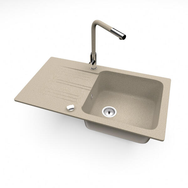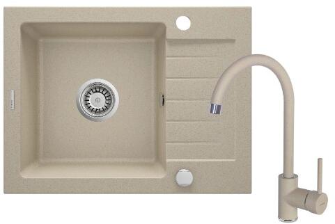 1 medencés, gránit mosogató csepegtetővel, csapteleppel|Kivitelezés: homok|Beszerelési mód: süllyesztett|Minimális szekrényszélesség: 500 mm|Hosszúság: 580 mm|Szélesség: 440 mm|Magasság: 164 mm|Mosogatógép-csatlakozással ellátott szerelvényekkel felszerelt mosogató|Automatikus lefolyóelzárással ellátott szifonok|Homok színű csaptelep|Csaptelep típusa: egykaros, kever