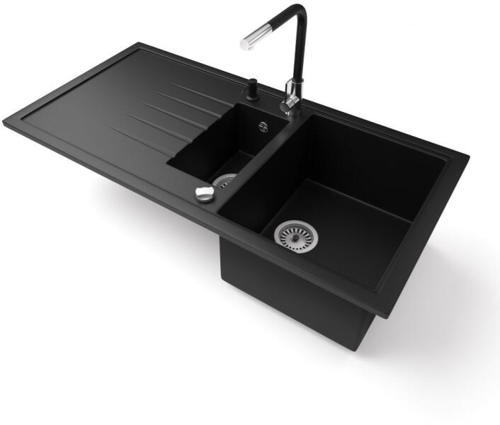 Nero Solarys a másfél medencés mosogatótálcák csúcsmodellje, a 100 cm-es hosszúságával könnyen helyet ad egy nagyméretű medencének, egy szintén nagyméretű csepegtető résznek és egy kisebb gyümölcsmosónak. Letisztult, modern formájával minden konyha kiemelkedő eleme lehet. A két medence lehetővé teszi párhuzamosan a mosogatást, öblítést vagy csak a vízben tartást