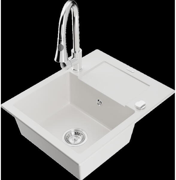 EOS Evinion gránit mosogató fehér színben. Megfordítható, így a mosogató medence kerülhet a bal- és a jobb oldalra is. A mosogatón 2 lyuk található egy a csaptelepnek és egy a beépíthető mosogatószer adagolónak vagy automata dugókiemelőnek. Összetétele 80% gránit őrlemény és 20% akril, ami megfelel a szabvány gránit mosogató összetételnek. Beépíthető 60 cm széle