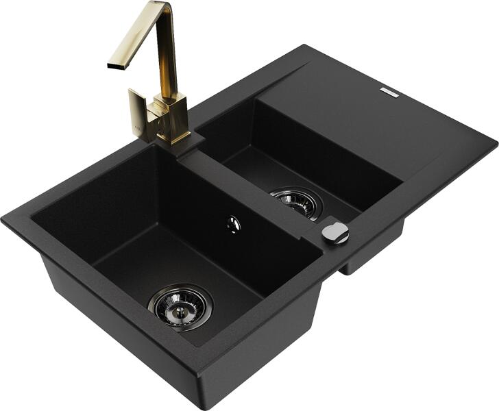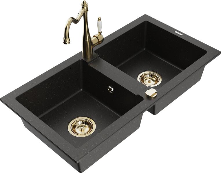 Mexen Mario, gránit mosogató 820x436x161 mm, 2 kamrás és mosogató csaptelep Carla, fekete-arany metál, 6504-75-670700-50 Gyártó: Mexen Sorozat: Mario + Carlo Mosogató: Méretek: 820x436x161 mm Kamra mélysége: 151 mm Kamra méretei: 356x336 mm Lefolyó átmérője: ø90 mm Típus: 2 kamrás Típus: felülről az asztal munkalapjába süllyesztve Anyaga: gránit (80% gránit adalékanyag
