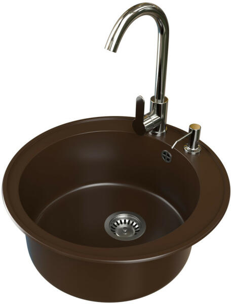 EOS Valero kör kialakítású gránit mosogató szett matt sötétbarna színben. A készlet tartalmazza az automata dugókiemelővel ellátott szifont is, ami mosogatógépre is csatlakoztatható. Méreténél fogva ideális kisméretű konyhákba, ahol az okos helykihasználás lényeges. Kis mérete ellenére, a 37 cm-es belső átmrőnek köszönhetően nagyobb edények is elférnek benne. M