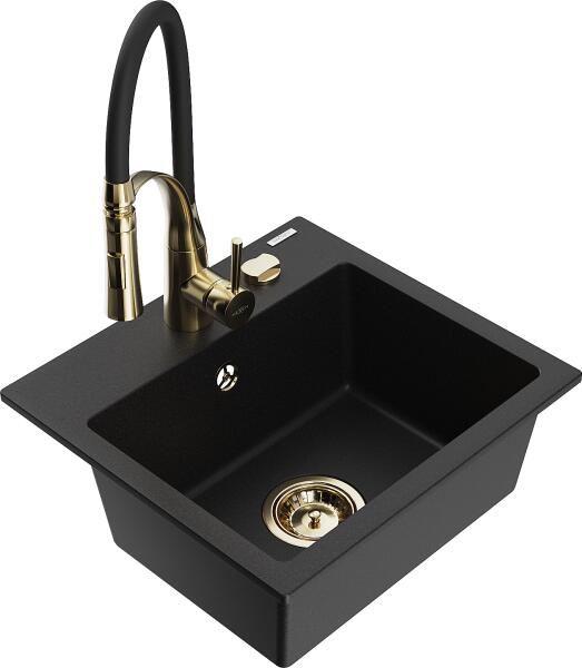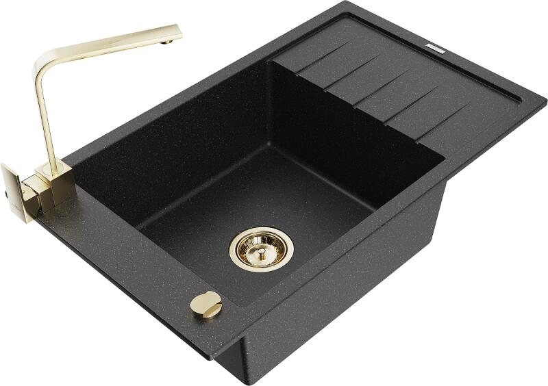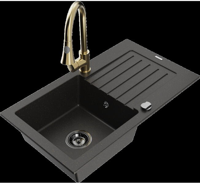 Mexen Elias, gránit mosogató gránit 795x480x200 mm, 1 kamrás, fekete-ezüst metál arany szifonnal és arany Rita mosogató csapteleppel, 6511-73-670300-50 Gyártó: Mexen Sorozat: Elias Modell: 1 kamrás, rövid leeresztővel Felszerelés: munkalapra Szín: fekete - ezüst metál Felületkezelés: sima Hossza 795 mm Szélesség 480 mm Magasság: 200 mm Kamra mélysége: 190 mm Kamra mérete: