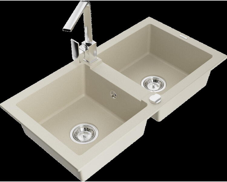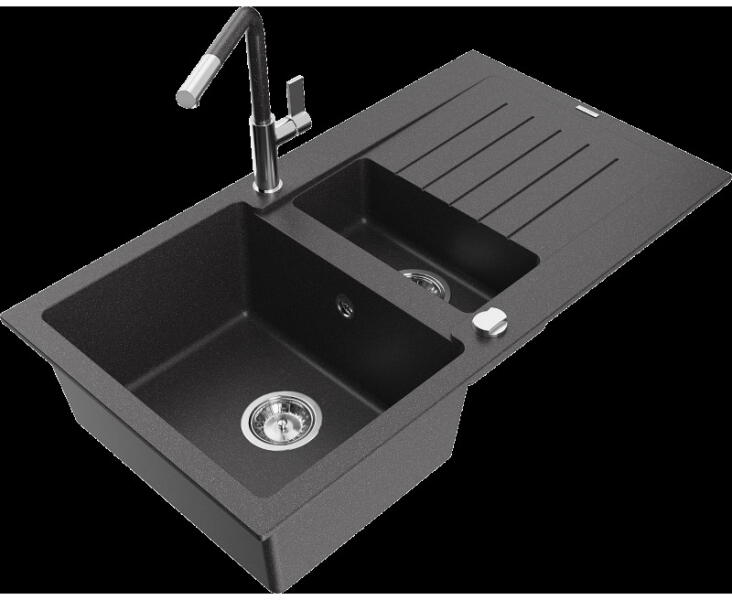 Mario konyhai mosogató: Méretek: 820x436x161 mm Kamra mélysége: 151 mm Kamra méretei: 356x336 mm Lefolyó átmérője: ø90 mm Típus: 2 kamrás Típus: felülről a munkalapba süllyesztve Anyaga: gránit (80% gránit adalékanyag 20% gyanta) Túlfolyó lyuk: igen Lyukak: 2 (1 x mosogató csaptelep, 1 x automatikus leeresztő csavar vezérlés) Nagy ellenállás a karcolásokkal és el