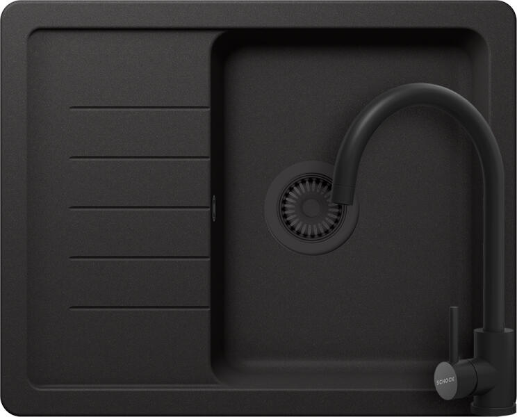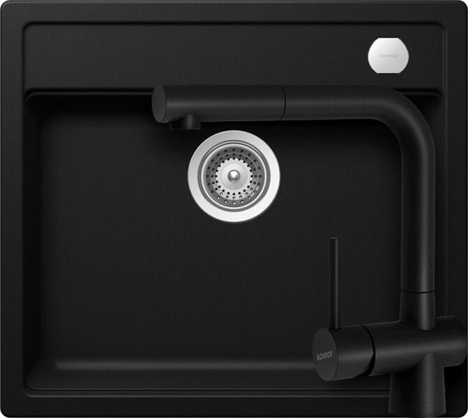 Schock Pinedo D-100XS konyhai mosogatótálca Cristalite Nero 620 x 500 mm, gránit, megfordítható, hagyományos beépítés, fekete - munkalapba beépíthető, 1 medence és csepegtető, megfordítható, ideálisan illeszkedik a minimum 45 cm-es alsószekrényhez. A csaptelep vagy más tartozék helye előre elkészített, könnyedén áttörhető. A csomagban találja a használati útmutatót