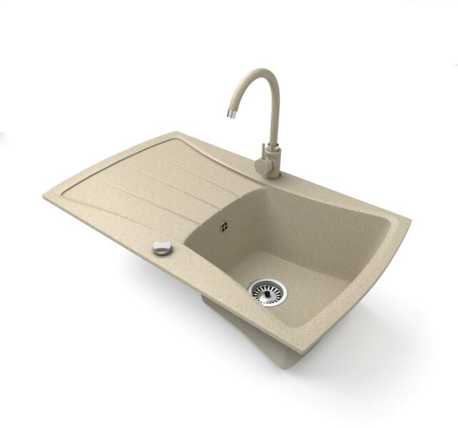 NERO Venezia gránit mosogató homokbézs színben. Egyedi és különleges formával tervezett egymedencés mosogató, kellően nagyméretű csepegtető résszel. A velencei gondolákat idéző, harmonikusan kialakított ívekkel a konyha esztétikus része, emellett anyagvastagságának köszönhetően rendkívül masszív konsktrukció. A mosogatón 2 lyuk található, egy a csaptelepnek és eg