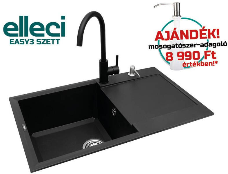 ELLECI - EASY3 szett Elleci akciós szett ajánlat: mosogatótálca+csaptelep ajándék mosogatószer-adagolóval. A SZETT TARTALMA Elleci Easy 300 G40 Nero mosogatótálca 1 medencés mosogatótálca csepegtetővel, munkalapra szerelhető, anyaga: granitek, színe: G40 nero, mosogatótálca mérete: 790x500 mm, medence mélysége: 220 mm, tartozékok: helytakarékos szifon, szűrőkosár, rögzí
