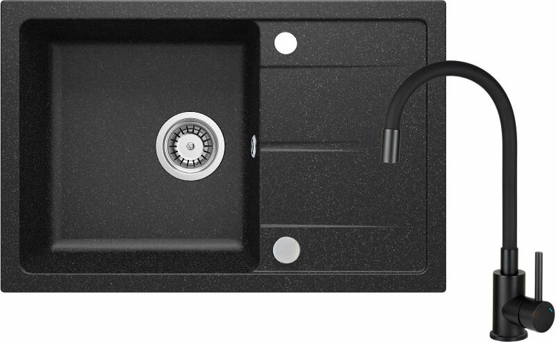 Mexen Enzo, 1 kamrás gránit mosogató csepptálcával 58x47 cm, konyhai csaptelep Telma, fekete, 6506-77-670200-70 Mosogató: Termékkód: 6506571005-77 Mérete: 576x465x174 mm Kamra mélysége: 164 mm Kamra méretei: 395x320 mm Lefolyó átmérője: ø90 mm Típus: 1-kamrás, rövid csepptálcával Típus: Az asztallapba süllyesztett Fekete szín Anyaga: gránit (80% gránit adalékanyag 20% g