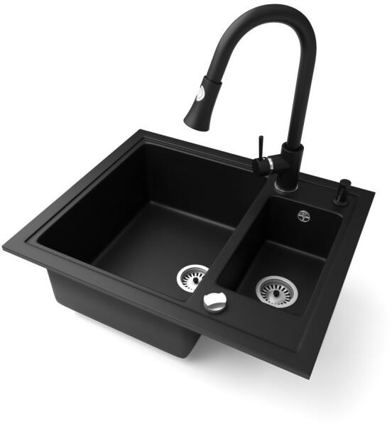 Mexen Tomas, gránit mosogató 800x500x190 mm, 2 kamrás és fekete csaptelep Rita, fekete, 6516-77-670300-70-B A konyhai mosogató műszaki adatai: Gyártó: Mexen Sorozat: Tomas Modell: 2-kamrás csepptálca nélkül Felszerelés: munkalapra Fekete szín Felület: sima Hossza 800 mm Szélesség 500 mm Magasság: 190 mm Kamra mélysége: 180 mm (nagyobb), 180 mm (kisebb) Kamra mérete: 440x387 m