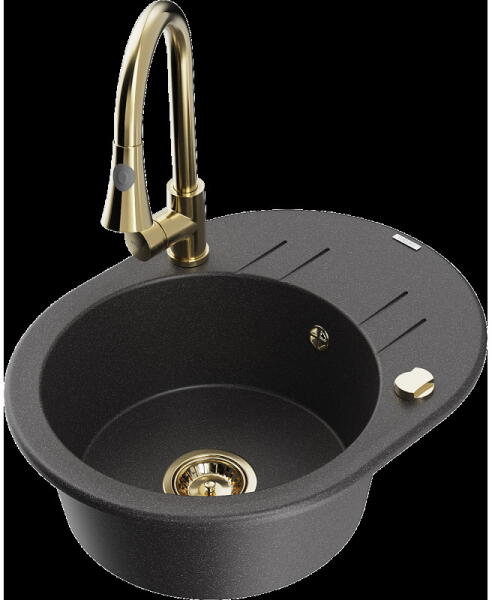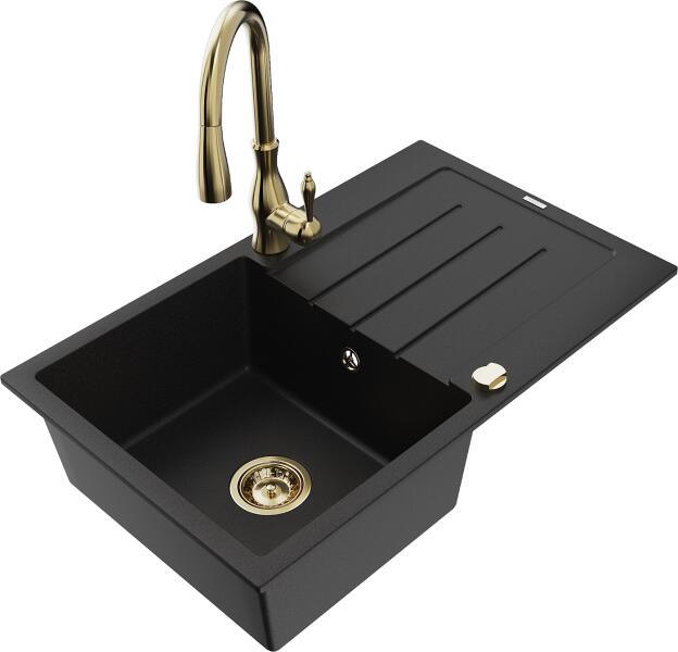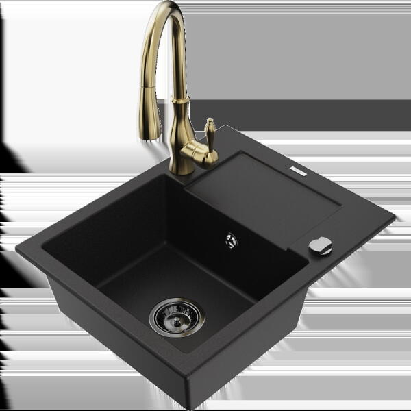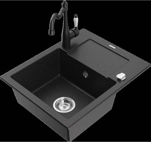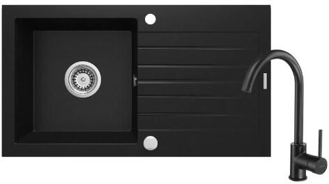 1 medencés, gránit mosogató csepegtetővel, csapteleppel|Kivitelezés: fekete|Beszerelési mód: süllyesztett|Minimális szekrényszélesség: 500 mm|Hosszúság: 760 mm|Szélesség: 440 mm|Magasság: 160 mm|Mosogatógép-csatlakozással ellátott szerelvényekkel felszerelt mosogató|Automatikus lefolyóelzárással ellátott szifonok|Fekete színű csaptelep|Csaptelep típusa: egykaros, keve