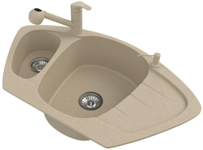 NERO Compact sarok gránit mosogató, ami egyben praktikus és impozáns látványelem is a konyhában. Tökéletes választás azokba a konyhákba, ahol a mosogató rész a sarokban lett kialakítva. Íves, de modern formatervezése nagyszerűen illik bármilyen stílusú konyhába. A mosogatón 2 lyuk lett kialakítva, egy a csaptelepnek és egy a beépíthető mosogatószer adagolónak vagy aut