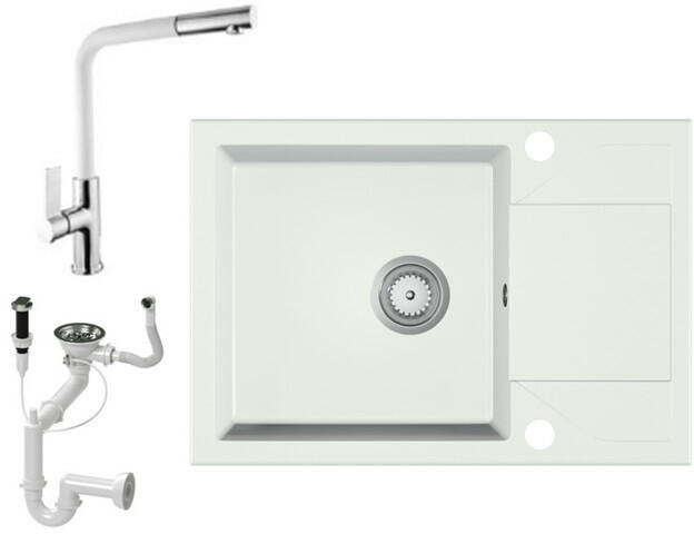 Adria (EOS) gránit mosogató szett fehér színben. Teljes készlet, ami tartalmazza a magasított csaptelepet, a beépített mosogatószer adagolót és a szifon készletet. Méreténél fogva ideális lehet olyan konyhákba, ahol az okos helykihasználás lényeges, viszont szükséges a megfelelő méretű medence és csepegtető is. A fehér gránit mosogatótálcák színe enyhén eltér a c