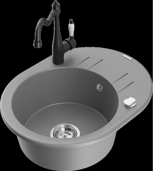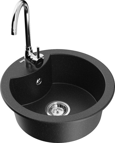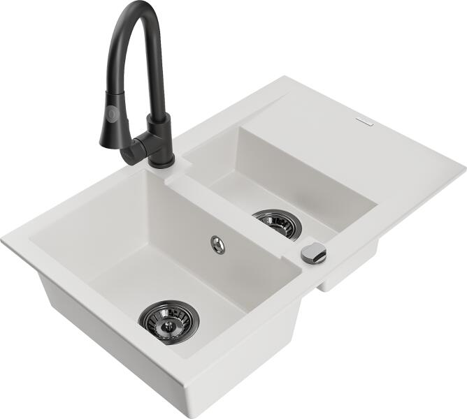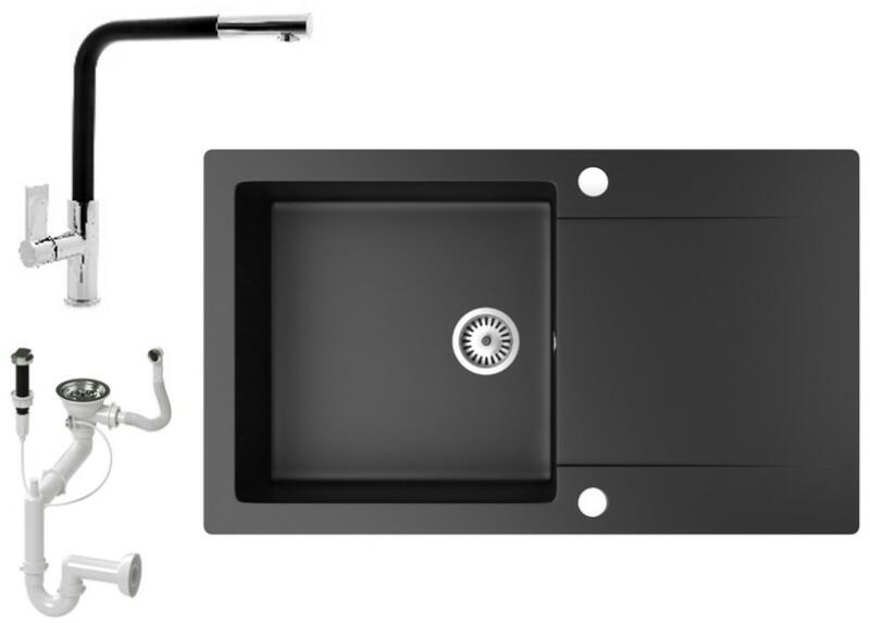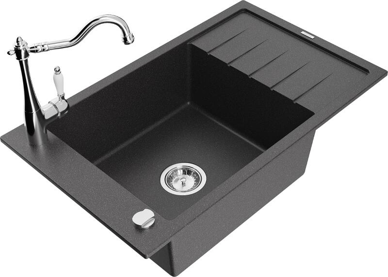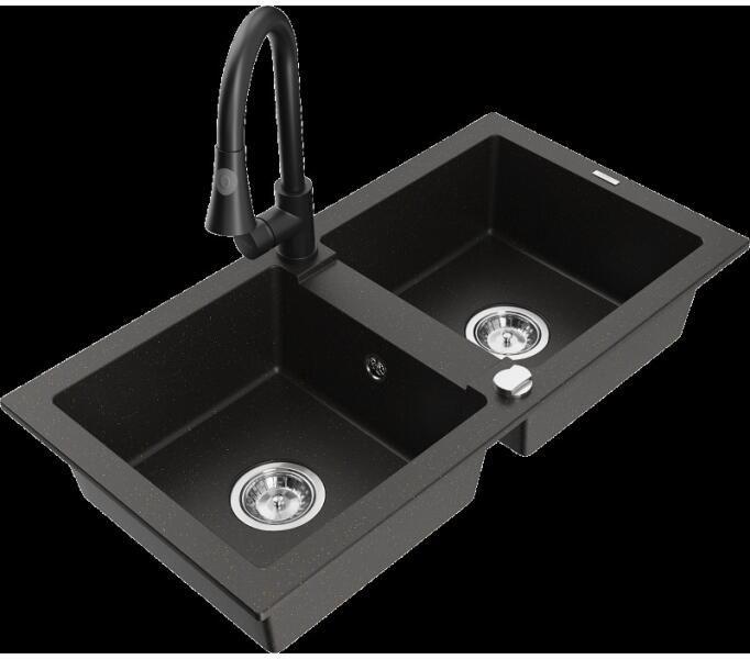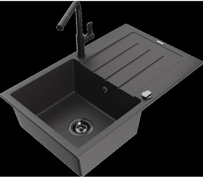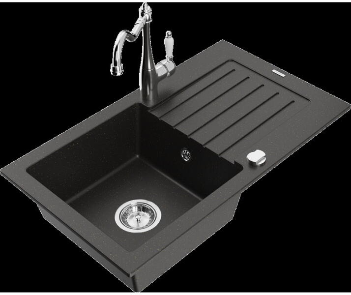 Mexen Elias, gránit mosogató 795x480x200 mm, 1 kamrás és mosogató csaptelep Carla, fekete foltos, 6511-76-670700-00 Elias konyhai mosogató: Szín: fekete foltos Méretek: 795x480x200 mm Kamra mélysége: 190 mm Kamra méretei: 465x420 mm Lefolyó átmérője: ø90 mm Típus: 1 kamrás, rövid csepegtetővel Beépítés: felülről a munkalapba süllyesztve Anyaga: gránit (80% gránit adalé