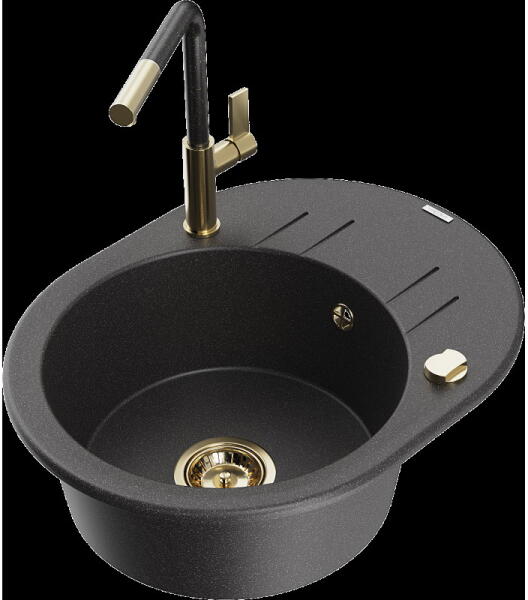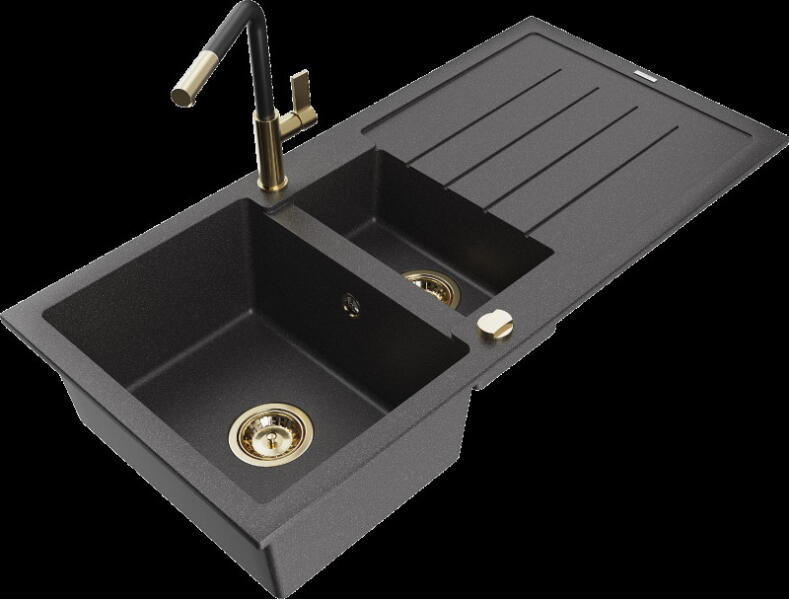 NERO Gold gránit mosogató szemcsés fekete színben. Praktikus kialakítású egymedencés mosogató, kellő méretű csepegtető résszel. Modern letisztult formájával egy modern konyha tökéletes része lehet. Különlegessége hogy a csepegtető rész nem bordázott, így a minimál stílusú konyhákba is nagyszerű választás. A mosogatón 2 lyuk található ezáltal a mosogató lehet j