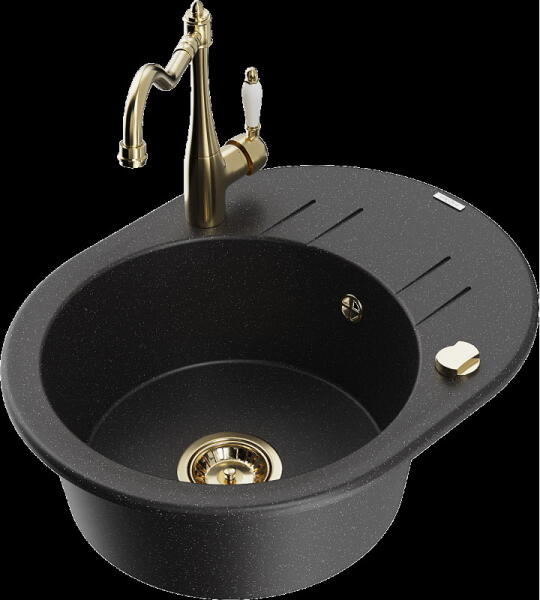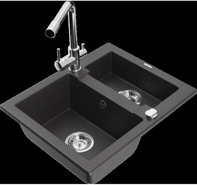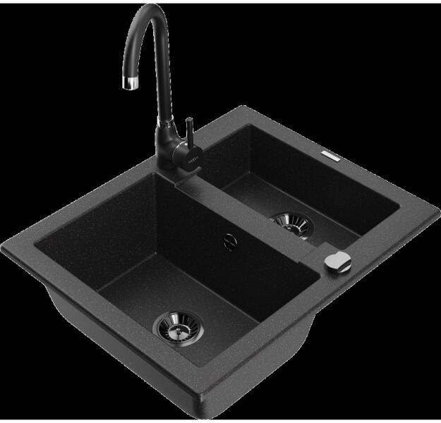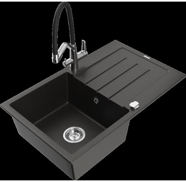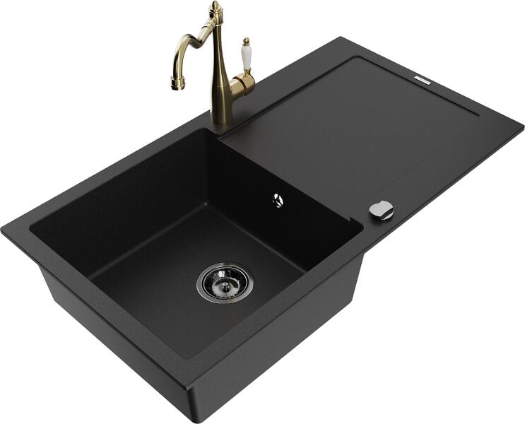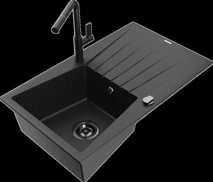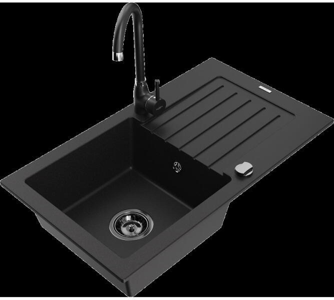 Mexen Leo, gránit mosogató 900x500x190 mm, 1 kamrás és mosogató csaptelep Carla, fekete, 6501-77-670700-50-B Gyártó: Mexen Sorozat: Leo + Carlo Mosogató: Méretek: 900 x 500 x 190 mm Kamra mélysége: 180 mm Kamra méretei: 430x415 mm Kimeneti átmérő: ø90 mm Típus: 1 kamrás lefolyóval Beépítés: felülről a munkalapba süllyesztve Anyaga: gránit (80% gránit adalékanyag 20% gya