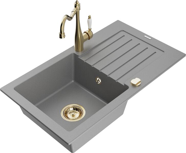 Mexen Pablo, gránit mosogató 752x436x161 mm, 1 kamrás és mosogató csaptelep Carla, szürke, 6510-71-670700-50 Gyártó: Mexen Sorozat: Pablo Méretek: 752x436x161 mm Kamra mélysége: 151 mm Kamra méretei: 356x332 mm Lefolyó átmérője: ø90 mm Szín: szürke Típus: 1 kamrás csepegtetővel Típus: felülről a pultba süllyesztve Anyaga: gránit (80% gránit adalékanyag 20% gyanta) Túl