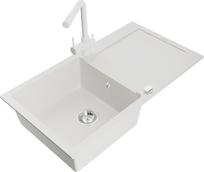Mexen Leo, gránit mosogató 900x500x190 mm, 1 kamrás és fehér Duero csaptelep, fehér, 6501-20-671600-20 Gyártó: Mexen Sorozat: Leo Modell: 1-kamrás s csepegtetővel Fehér szín Felületkezelés: sima Hossza 900 mm Szélesség 500 mm Magasság: 190 mm Kamra mélysége: 180 mm Kamra mérete: 430x415 mm 500 mm-es méretű szekrényekhez Szifon + automatikus leeresztő csavar Anyaga: gránit